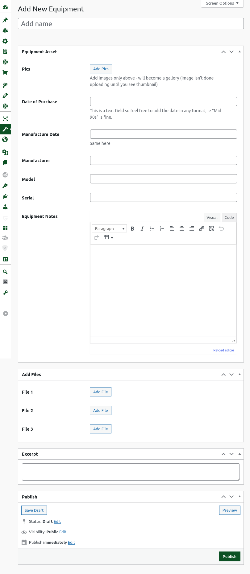 Add Pics, fill in the text/paragraph fields and add Files. Name is the only thing required.