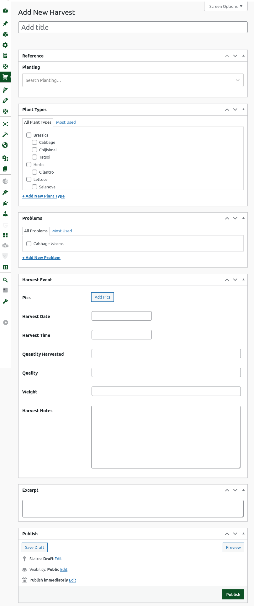 The rewarding part. Harvesting the things you worked so hard growing. This is probably the most important data you can add because you it gives you a way to track your production levels. Select the Planting that you are now harvesting, select Plant Types for sorting and filtering Harvests later on. Attach any Problems that the plants you’re harvesting had and add the Harvest Details.