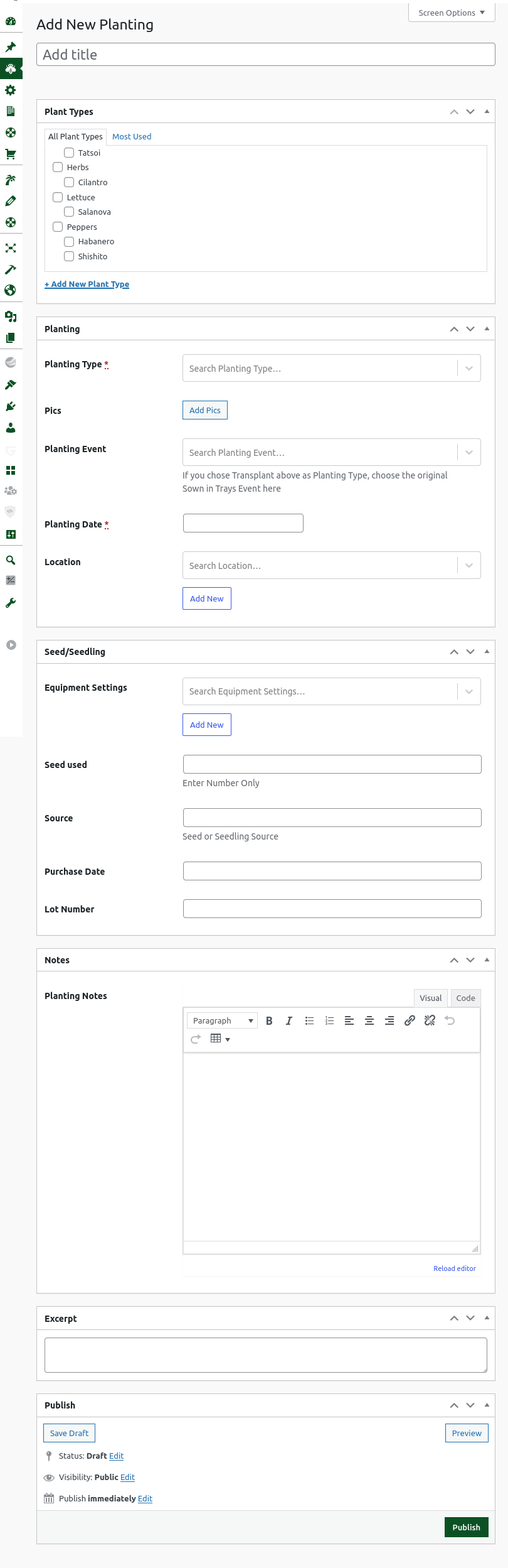 Now we’re adding some data. Again, it’s pretty self explanatory. Name, Planting Type and Planting Date are the only required form fields. It’s recommended that you fill out everything that applies because that data can be useful for later examination. There are three Planting Types; Sown in Trays, Transplanted and Direct Sown.